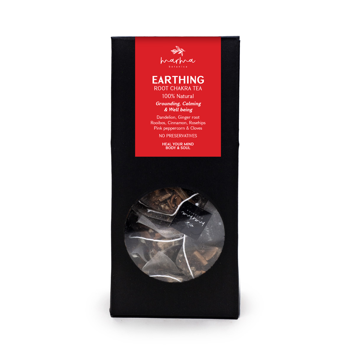 100% natural · High-quality ritual herbs · Corn fiber eco-biodegradable tea bags · Caffeine-free · Designed for Root chakra grounding and earthing practices